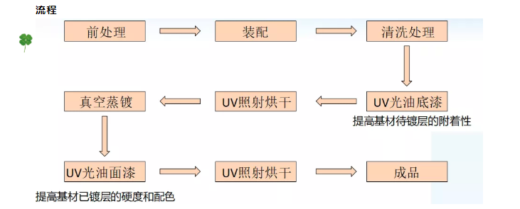 真空蒸镀有三层:底漆层(6~12um)+镀膜层(1~2um)+面漆层(10um),将基材表面杂质、灰尘等用布擦拭干净,提高喷射良率。将基材装配在专用挂具上,用以固定于流水线上,并按设计要求实现外观和功能的遮镀。由于基材是塑胶件,在注塑时候会残留空气泡,有机气体,塑胶表面不够平整,直接蒸镀吸附差且不光滑平整,涂一层底漆会提高镀层的附着性且表面光滑平整效果好。将挂件装配于真空容器内,加热,实现蒸镀。