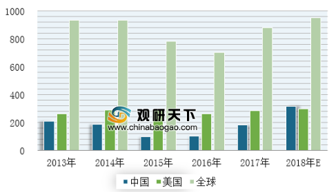 2013-2018年E全球、美国与中国工程机械市场规模对比(单位:亿美元)