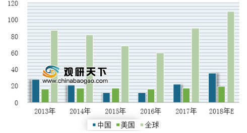 2013-2018年E全球、美国与中国工程机械销量对比(单位:万台)
